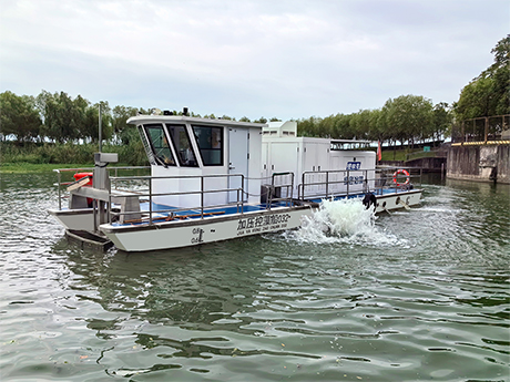 公司研發(fā)的加壓控藻船,以玻璃鋼船體為平臺,配置藍(lán)藻打撈、壓力控藻和曝氣裝置...